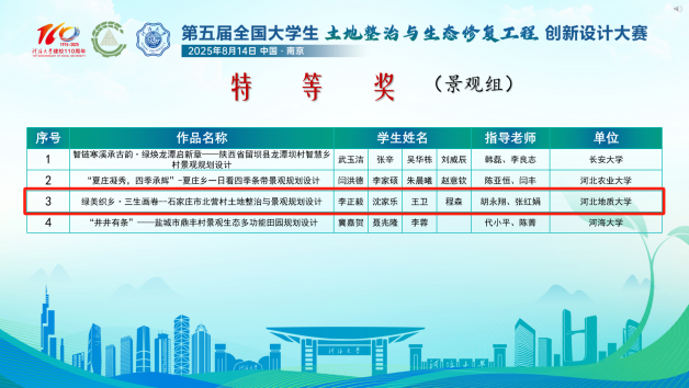全国大学生土地整治与生态修复工程创新设计大赛旨在全面落实生态文明战略,优化国土空间开发保护格局,助力大学生运用理论知识解决资源环境领域土地整治与生态修复问题,共同为中国式现代化贡献智慧和力量。在本次大赛中,我院参赛学生和指导老师们在临时党小组的带动下,以黄大年团队“教书育人、敢为人先”的敬业精神为指引,努力推进项目进展,反复打磨和完善项目材料,最终在决赛中斩获佳绩。