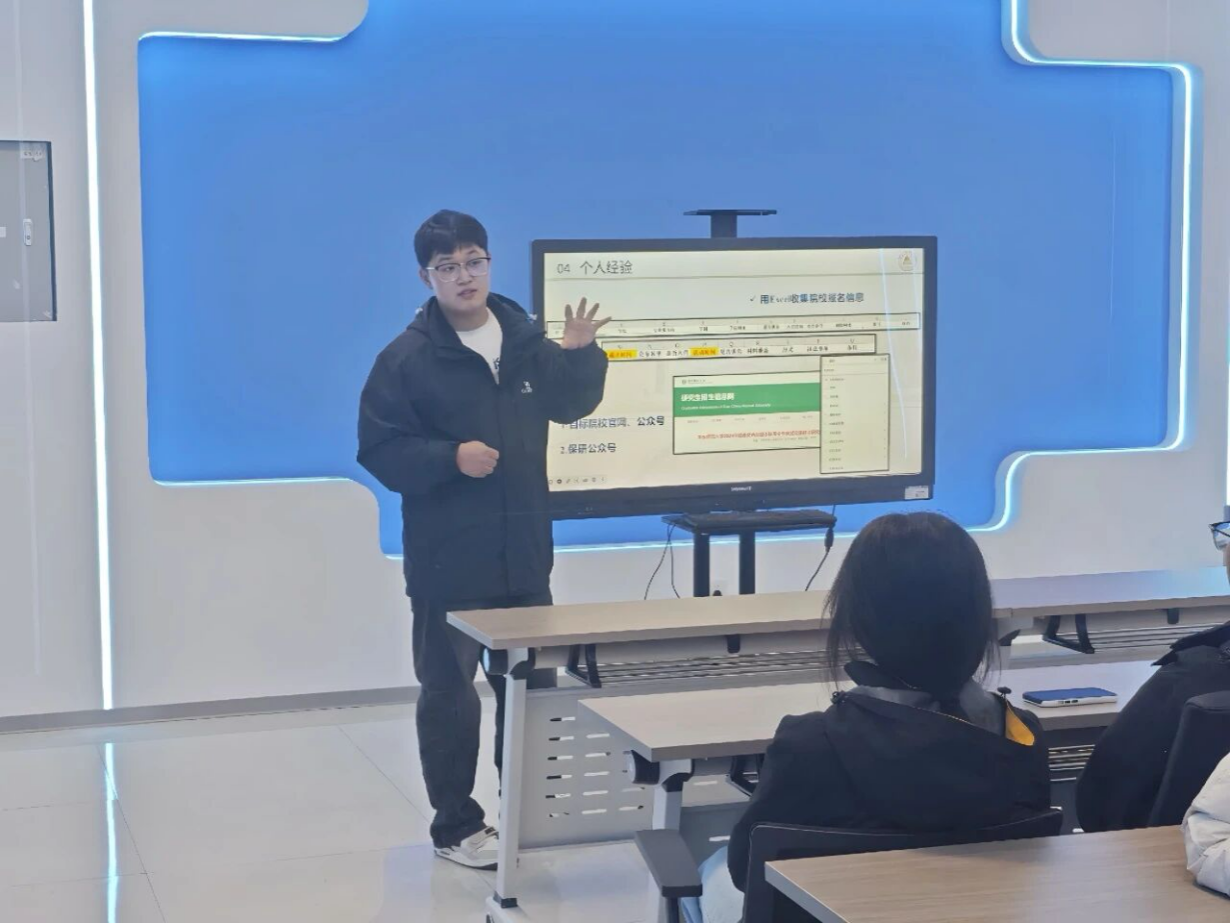 分享会上,张杰同学结合其自身推免至重点高校的成功经验,系统梳理了推免全过程。他提出的“核心竞争力金字塔”模型,强调以专业成绩为基础、科研与英语能力为支撑、实践荣誉为补充的综合竞争力增长体系,并分享了从信息搜集到面试考核的实用技巧,现场演示了时间管理工具的高效运用方法。张杰同学的分享既有理论体系,又有实践经验,为我院有志于保研的同学点明了方向、提供了方法。
