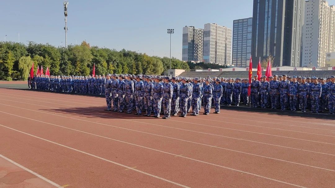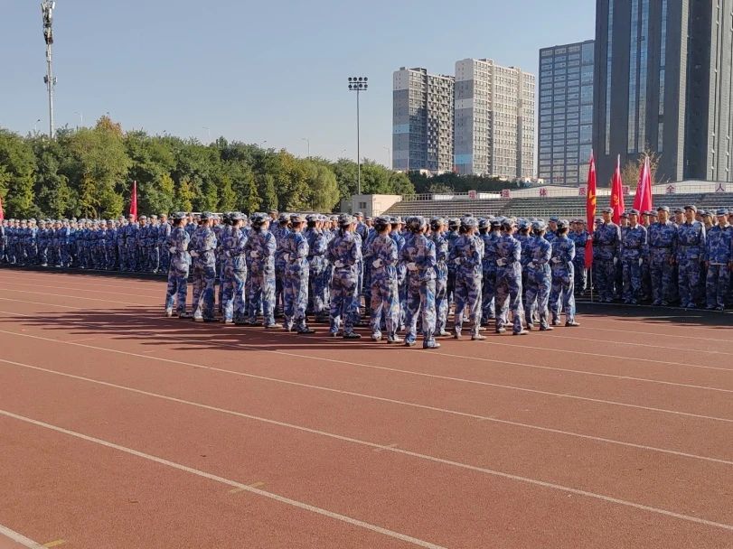 本部操场上举行了新生军训汇演。在激昂的进行曲中,国旗护卫方阵整齐划一、气宇轩昂!庄严的升旗仪式后,2023级新生军训会操表演正式开始。
