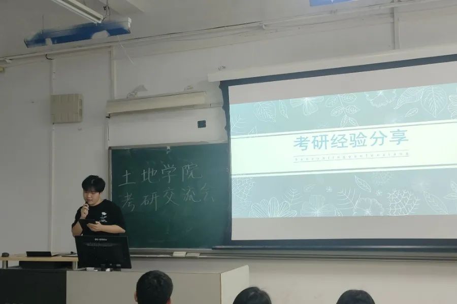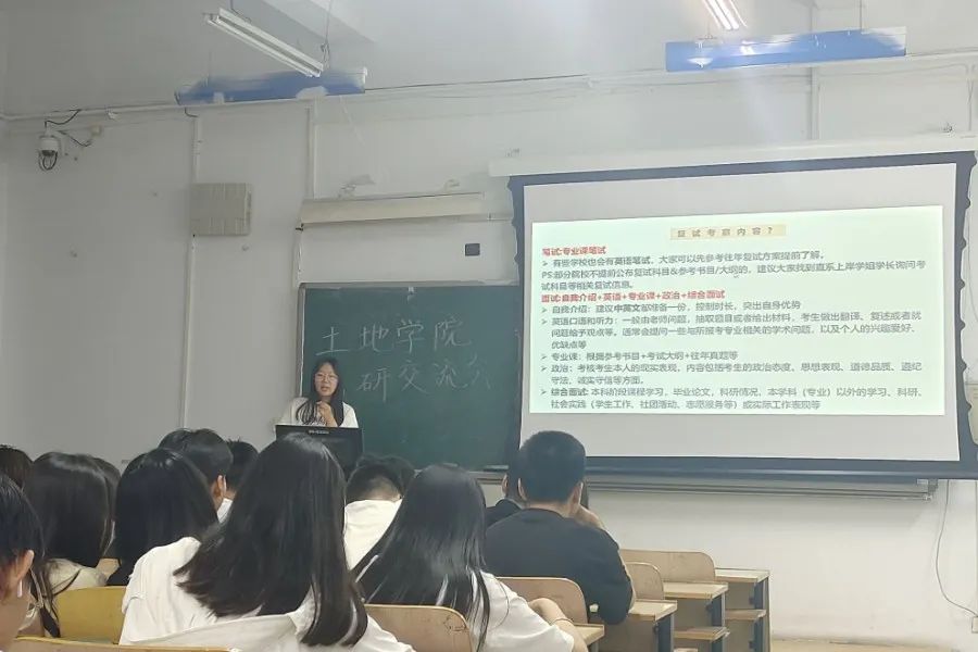 最后,土地资源管理专业的崔妍学姐为我们分享了复试方面的经验。从分数线与排名、高分过校线、没过校线过国家线三个方面解说。复试是考研的最后一关,也是展示自己才华和实力的重要机会。崔妍学姐揭示了复试的小秘诀,让我们在面试中更加从容自信,使我们受益匪浅。
