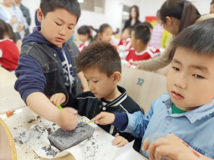 为进一步引发小朋友对古生物知识的思考,活动设计了“小小考古学家”实践内容。三个小朋友及其家长作为一组,共同努力挖掘恐龙化石。组内成员 分工协作,家长与孩子配合默契,共同面对挑战,最终全部成功复原出完整的恐龙骨骼模型。