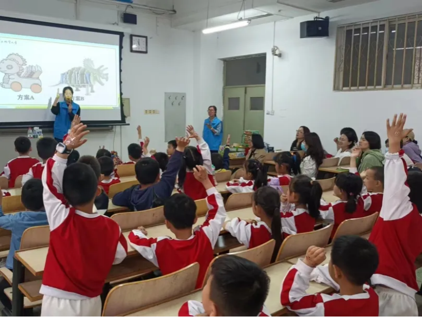 除了常规的知识讲解,还通过播放恐龙主题动画片和英语单词大比拼等方式引导小朋友们学习恐龙的相关知识,既拓展了小朋友知识宽度又巩固了学校课堂知识。