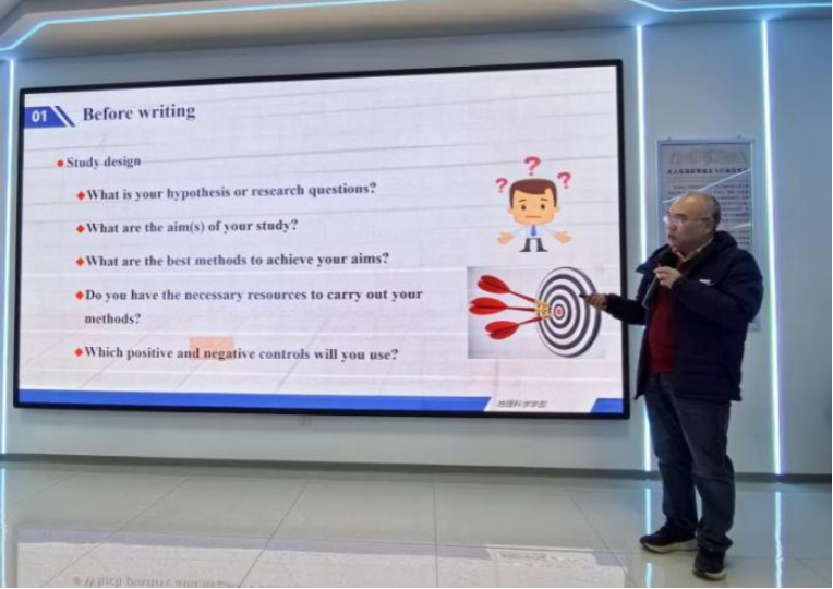 张光辉教授聚焦SCI论文写作全过程,系统剖析了高质量英文科技论文的架构要点、写作方法与投稿策略,并结合自身经验分享了实用技巧。讲座内容层次清晰、案例生动,为师生提供了切实可行的写作指导。在交流环节,张教授与在场师生就论文选题、逻辑组织和语言表达等具体问题展开深入讨论,并提出多项针对性建议。他鼓励青年学者注重日常科研积累,不断提升学术表达能力,为长远发展奠定基础。
