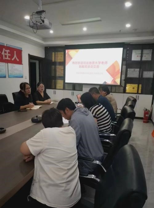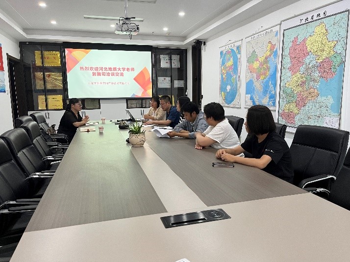 陈艳红和高彦丽老师介绍了学院专业设置、测绘工程专业人才培养目标、毕业要求、课程设置等情况,并就学生就业、人才培养、产教融合、实习实践基地建设与企业人员进行了深入交流。石家庄皓图空间信息技术有限公司总经理魏耀璞详细介绍了公司业务范围、经营情况和人才需求等情况。