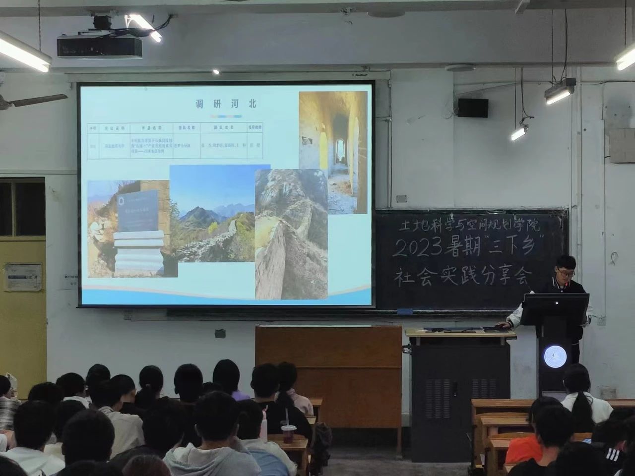 其次,由张杰同学分享了他的众多社会实践活动经历以及优秀成果,包括“三下乡”乡土规梦实践团活动,调研河北,挑战杯——红色专项等,张杰同学的实践视频画面使同学们为这份实践精神动容,并对未来的实践活动充满向往。