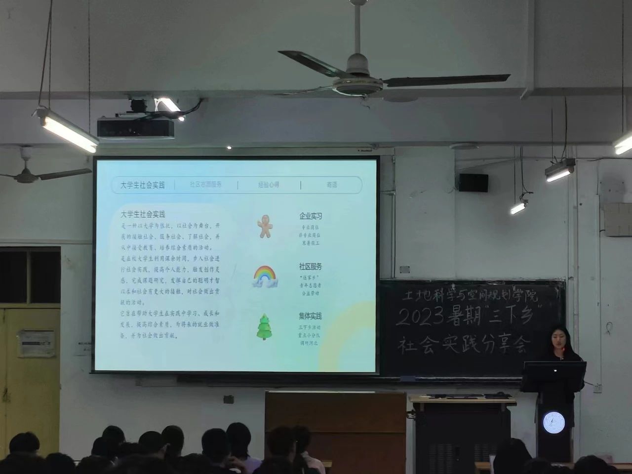 首先,由卢理然同学对暑期“三下乡”的社会实践活动进行了全面阐述。在他的发言中,他详细介绍了社会实践的流程以及各项活动的具体细节,这让同学们对大学生社会实践活动有了更充分地了解。